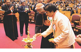 Cardinal Ivan Dias, the Vatican’s senior most Indian, sat in the front row with a tilak* on his forehead having lit the traditional lamp to inaugurate the ceremonies. […] *Not in the picture