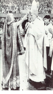 Pope John Paul II visited New Delhi, India, 5-8 November, 1999. The above picture, taken at Jawaharlal Nehru Stadium, New Delhi, on November 7, is sourced from The Hindu newspaper group’s “Frontline” magazine, Volume 16, No. 24.