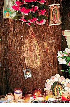 Earlier this month, on the feast day of Our Lady of Guadalupe, about two dozen Mexican farm workers and their families gathered around a large shade tree at a Yuba City housing project. They saw an image of Mary in a large knothole and have laid candles and poinsettias at the base of the tree.