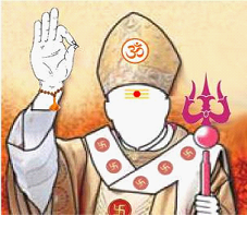 His right hand was raised in the upadesa mudra, conveying a guru imparting what he has himself gained through yogic meditation – “enlightenment”; the other held a trident, the trishul of the deity Shiva, instead of the customary crozier or bent pastoral staff styled after a shepherd’s crook or the one topped by a crucifix. Suspended from the new Pontiff’s extended right hand was a rudraksha mala, worn by holy men, the Hindu equivalent of the rosary, the rudraksh beads signifying the tears of Shiva. Another Hindu sacred symbol, the ubiquitous “OM”, adorned the papal mitre. His forehead marked horizontally with a three-stripe mixture of turmeric or saffron and sandalwood paste and a circular red tilak or bindi, he positioned himself as the truly inculturated catholic Satguru who accepts that religions are but different paths to the divine.