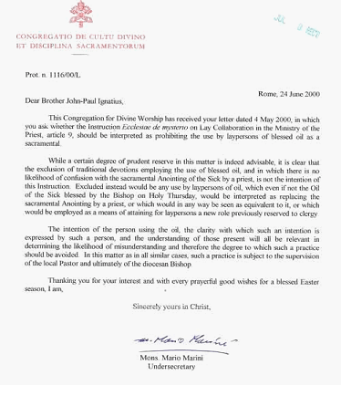 This Congregation for Divine Worship has received your letter dated 4 May 2000, in which you ask whether the Instruction Ecclesiae de mysterio on Lay Collaboration in the Ministry of the Priest, article 9, should be interpreted as prohibiting the use by laypersons of blessed oil as a sacramental.