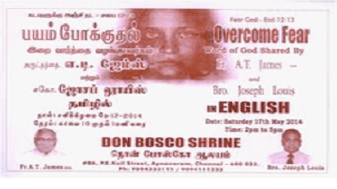 I had been informed about him over a year ago. A well-catechised family had been to one of his Bible classes held at a hall in Egmore. They had not liked what they saw and heard. The Bible class was preceded by Holy Mass celebrated by Fr. James A.T., SDB, from Don Bosco Shrine, Ayanavaram. Before the preaching commenced, Louis went apart and prayed over himself, placing his right hand on his own head. The preacher simply quoted Bible verses and gave his personal interpretations of them. Since I am going to record Louis’ teachings at a meeting that I attended, I will skip them here.