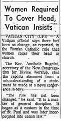 It was written into the 1917 Code of Canon Law, Canon 1262, that women must cover their heads — “especially when they approach the holy table” (“mulieres autem, capite cooperto et modeste vestitae, maxime cum ad mensam Dominicam accedunt”) — but during the Second Vatican Council, Bugnini (the same Freemason who designed the Novus Ordo Mass) was asked by journalists if women would still have to cover their heads. *See the following page