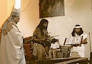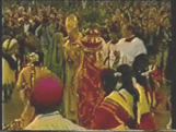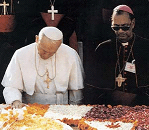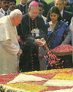 During his Togo visit the Pope met with snake-worshippers who were later to participate at Assisi. In 1986 he visited the main Rome Synagogue on terms and seating posture of absolute equality with the old and superseded Covenant of Judaism. In India, 1986, John Paul II allowed the ’tilak’, a sandal wood paste mark, to be applied to his forehead by a Hindu “Priestess”. Everywhere he went in India, he quoted from the Hindu scriptures and actually partook in pagan rites. He praised the Hindu syncretist Gandhi to the skies. Gandhi said “I am a Christian and a Hindu and a Moslem and a Jew” and the Baha’is acted as religious advisers to the movie on Gandhi. Moreover he recited the so-called “peace prayer”, the “asothama satgamaya” whose introduction by Cardinal Hume in England the great Hamish Fraser tried so hard to prevent. What chance did Hamish have when the pope himself used that prayer? In Suva, Fiji, November, 1986, the Pope drank “kava” a drink once condemned as a tool of devil worship. The Pope downed it in one swallow.