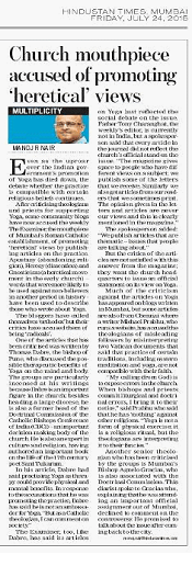 In his article, Dabre had said practising Yoga as therapy could provide physical and mental benefits. In response to the accusations that he was promoting the practice, Dabre has said he is not an ambassador for Yoga. “But as a Catholic theologian, I can comment on society.”