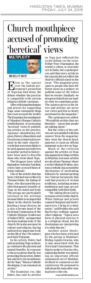 One of the articles that has been criticised was written by Thomas Dabre, the bishop of Pune, who discussed the possible therapeutic benefits of Yoga on the mind and body. The groups are particularly incensed at his writings because Dabre is an important figure in the church: besides heading a large diocese, he is also a former head of the Doctrinal Commission of the Catholic Bishops Conference of India (CBCI) – an important decision-making body of the church. He is also an expert in culture and religion, having authored an important book on the life of the 17th century poet Sant Tukaram.