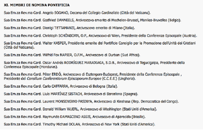 Archbishop Mark Coleridge, Archbishop Sanchez Sorondo, Bishop Johann Jozef Bonny, Bishop Jean-Paul Vesco OP, Bishop Jean-Marie Lovey, Bishop Jean-Luc Brunin, Bishop Franz-Josef Hermann Bode, Bishop Marcello Semeraro, Bishop Felix Gmür, Bishop Markus Büchel, Msgr. Pio Vito Pinto (Dean of the Roman Rota and head of the Pope’s commission for annulment reform), Fr. François-Xavier Dumortier SJ (Rector of the Pontifical Gregorian University, which played host to the “Shadow Synods” of May and September 2015), Fr. Antonio Spadaro SJ, Director of the La Civilta Cattolica and a leading proponent of the new pastoral direction of the current Pontificate, Fr. Adolfo Nicholás Pachón, Superior General of the Society of Jesus, Vatican spokesman Fr. Thomas Rosica, etc.