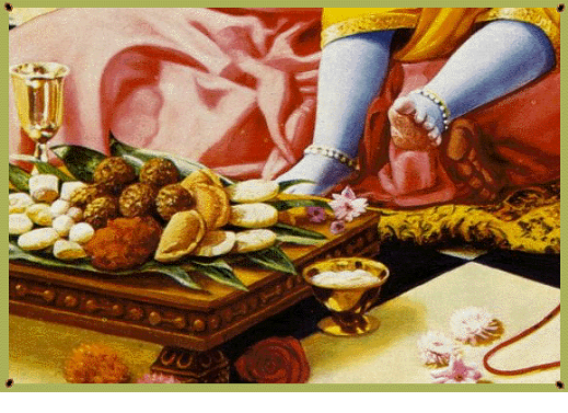 Some strict Gaudiya Vaishnavas, most commonly initiated ISKCON devotees, will eat only prasada, i.e., everything they eat is first offered to Lord Krishna, not simply a few items like most other Hindus do. In addition, the cooking of prasada is done without tasting, for it is not for their own consumption, but to offer to Krishna — they will receive the remnants of Krishna’s food (which they consider to be non-different to Krishna). ISKCON temples are known for providing free prasada meals to all who come, as they believe that this is not only feeding the poor but providing them with Krishna’s mercy as well.