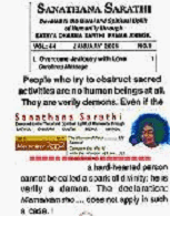 That there is a spark of Divinity in every living being and even in all matter, was one of his most admired ‘revelations’: “All beings are sparks of the Eternal Divinity” page 101 from his ‘Discourses in Kodaikanal 1998’). Hed refuted this again in 2001 (see right hand scan of excerpt from his discourse). Further, in a later discourse two years after that he confirms his complete reversal by proclaiming that there is not even a spark of divinity in his critics! [“… a hard-hearted person cannot be called a spark of Divinity; he is verily a demon.” p. 323, Sanathana Sarathi, November 2002].