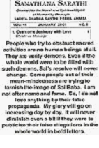They are trying to reduce the respect for Sai Baba with all this lowly publicity. I do not desire respect at all. If it lessens, what is the loss for Me? Gradually the respect will go on increasing. Even if this publicity goes on, using all the letters of the alphabet, in this whole world and in our country of Bharat, My glory and the respect for Me will NOT BE reduced by even a fraction.