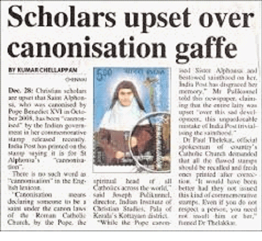 Christian scholars are upset that Saint Alphonsa, who was canonised by Pope Benedict XVI in October 2008, has been “cannonized” by the Indian government in her commemorative stamp released recently.
