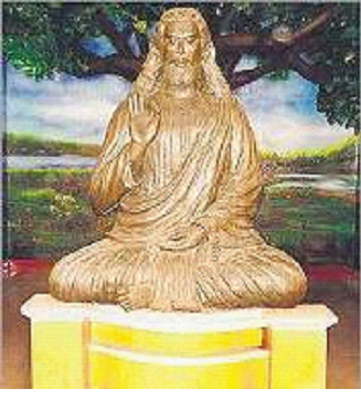 Eclipsing the conventional crucifix, Christ is sculpted in a sitting posture. He meditates in Abhayamudra under the shadow of a peepul tree.