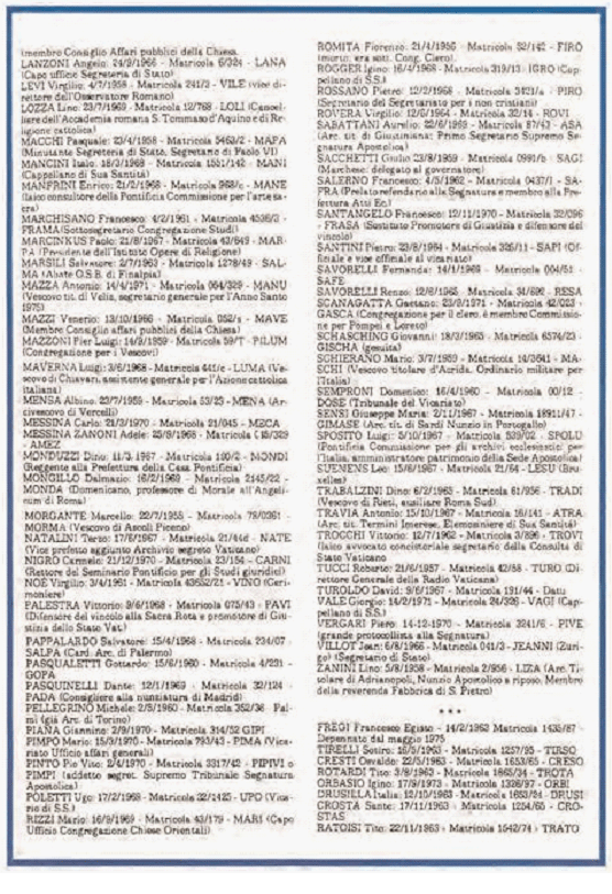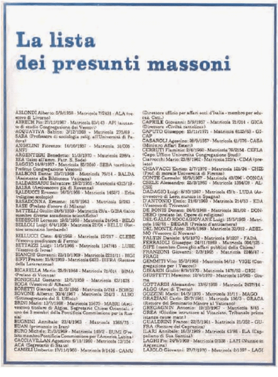 In September, 1978, during the brief pontificate of Pope Luciani, the “List of Pecorelli” appeared on “OP” (Political Observer), the magazine of Lawyer Mino Pecorelli. It was not a great surprise for Father Villa to read many names of senior officials as they had already been removed from their positions, some time before, since he had provided the documents to the Holy Office of their membership in Freemasonry.