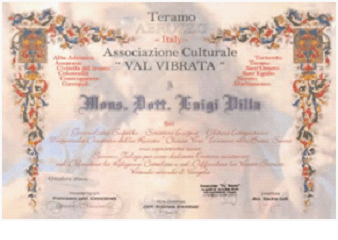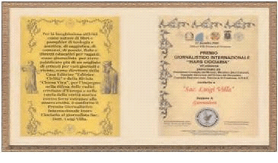 In December, 2008, Father Villa received his first award which was the “International Inars Ciociaria Journalist Award,” «… for his very extensive work as a journalist, author of books and pamphlets on theology, asceticism, non-fiction … and for his commitment to defend the Christian roots of Europe and for his protection of truth against forces alien to our civilization.»