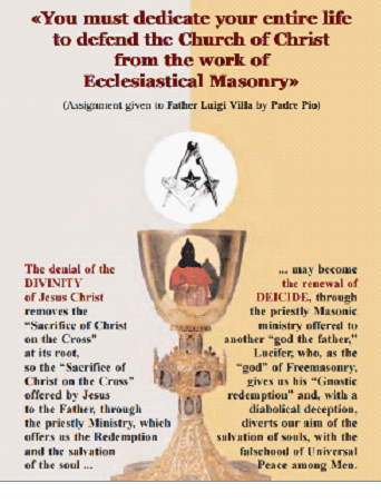 An Italian priest named Fr. Luigi Villa Th.D. (February 3, 1918-November 18, 2012*) of the diocese of Brescia was blessed by St. Padre Pio, by his own Archbishop Msgr. Giambattista Bosio and by Venerable Pope Pius XII who approved the mandate given by Padre Pio to Fr. Villa to dedicate his entire life to defend the Church from the cancer of Freemasonry and to expose other errors in the highest echelons of the Church.