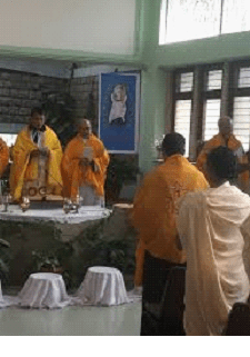 They have given themselves Hindu holy names with swami at one end and Ananda at the other. They are dressed in Ochre robes or Dhoti Kurta and wear rudraksha or Tulsi Mala around their necks. They paint their foreheads with sandal paste in the morning, kumkum at noon and sacred ash at night. Hindu symbols and scriptural texts are used in their thrice daily worship which they call Sandhya. They celebrate mass after the pattern of Hindu pooja with dhoopa, deepa and arti. They sing Hindu devotional songs composed by Hindu saints in various Hindi languages. They have built chapels which look like Hindu temples. The mission station where they live are now known as Ashrams. The mission emblems carry the Om, the sacred Hindu symbol and mantra, interlocked with Christian cross e.g. – Indian Missionary Society Priests. Other changes which took place are – the posture during Mass both for the Priests and the faithful are adapted to the local usage i.e. sitting on the floor and footwear removal before entering Church. Kissing of objects is adapted to local custom i.e. touching the objects with one’s finger or palm of one’s hand and bringing the hand to one eyes or forehead. The corporal could be replaced by a tray (thali) of fitting material. Oil lamps could be used instead of candles. Prayers in local languae instead of Latin or Syrian makes it easy for common people to participate. Even the way of receiving the communion has changed. Previously Priest used to give it to the faithful people as they were not allowed to touch it but now people takes it as Hindu’s take Prasad.