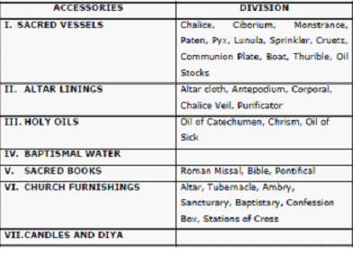Accessories are the objects which include material setting for divine worship in Church. It includes Sacred vessels, Altar linings, Holy water oils, Candles, Church furnishing and Sacred books.