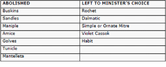 Use of Buskins, Sandles, Maniple, Amice, Gloves, Tunicle, Dalmatic, Mantellata was abolished. Wearing of Rochet, Dalmatic by Bishop under Alb was emitted or left to the ministers choice. Choice of wearing simple, plain, Ornate Mitre was left to the Bishop.