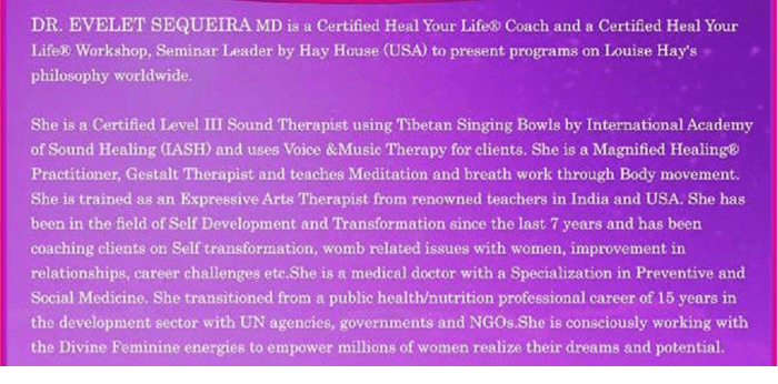 Dr. Evelet Sequeira MD, is a Licensed and Certified Heal Your Life ® Workshop Leader and Coach (Hay House – USA) based on the Louise Hay Philosophy to conduct Transformation workshops globally, a Gestalt Therapist and teaches Mindfulness based stress management.