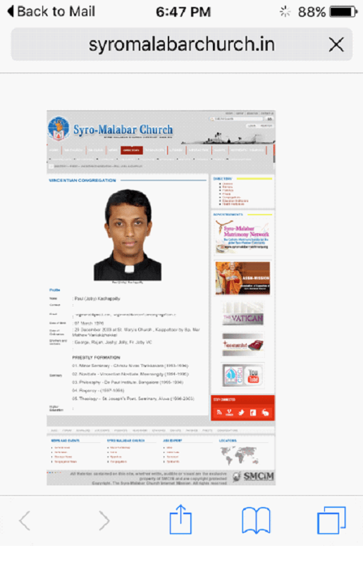 In the case of Fr. Joby Kachappilly VC (04 and the present file), a retreat centre Director who sexually molested two young girls (among others) over a period of 3 to 4 years, hoping to keep it within the Church and not “wash the church’s dirty linen in public”, and following protocol, we respectfully contacted (over the ‘phone commencing March 18) the rapist’s confreres and his Provincial Superior and again the Superior and his Archbishop (of the Syro-Malabar rite, both by email on April 6), the senior executives and heads of Church bodies and Commissions (including the Presidents of the CBCI and the CBCI) as well as the Apostolic Nuncio to India, going up to April 22, 2017. Finally, after six weeks we received a response on June 7 from the President of the CCBI (Latin rite) asking us which rite the rapist priest belonged to, evidently already knowing fully well the answer and attempting to evade responsibility for the Syro-Malabar rite priest’s crimes! Today, almost a month later, the Cardinal, Oswald Gracias, has not replied to my email response of June 7 to him; and June 18, 2017 marked three months of our futile attempts to bring the Vincentian priest to justice (one of the victims is ready to testify face-to-face against the serial molester-rapist).