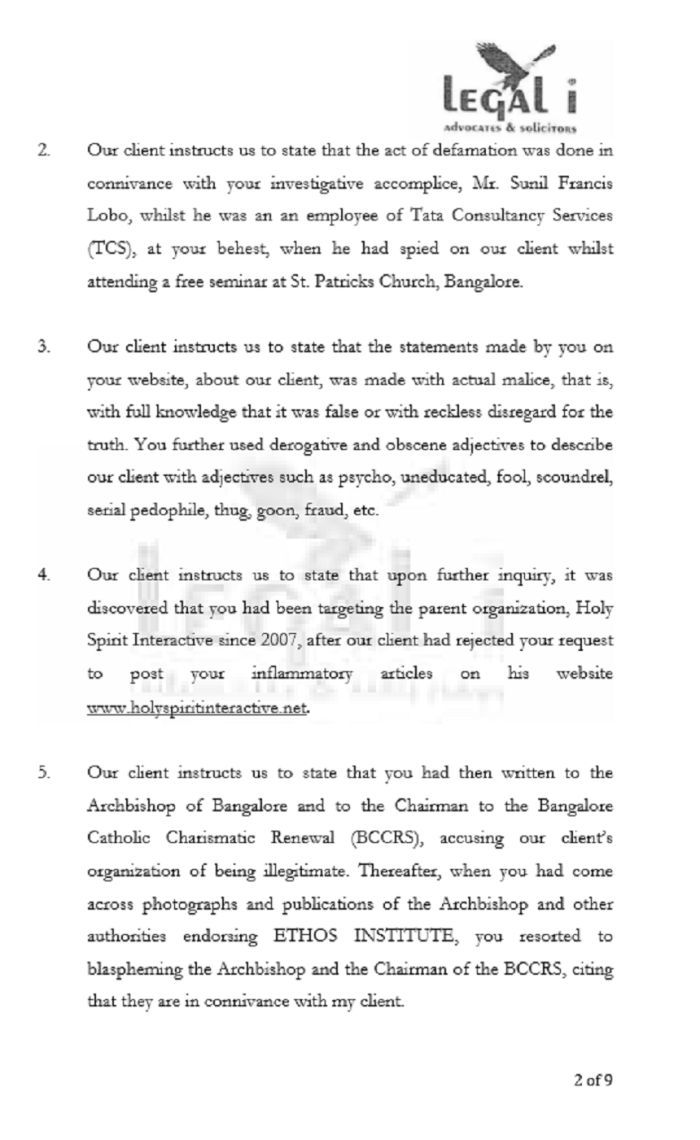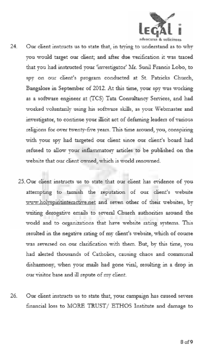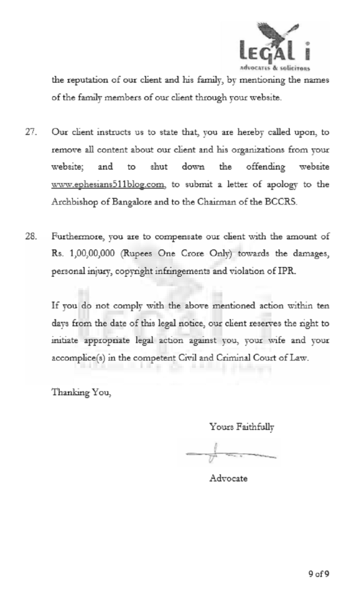The Archbishop of Bangalore (who is referred to by Dixon on page 9, point no. 27 of the “legal notice”* sent by him to me) and lay Catholic leaders in India and Dubai who prop up Dixon and his schemes will have to continue to bear with our naming them in our reports.