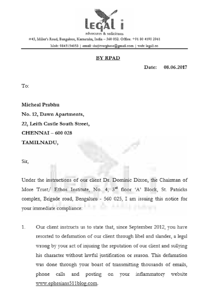 “(T)he malicious campaign titled “Criminal Acts of Mr. Dominic Dixon” was investigated by Cyber Crime investigators who have verified with Facebook, Google Inc. and Word Press. Cyber Crime Police of Bengaluru have given their inputs, confirming your involvement of posting defamatory content about ETHOS INSTITUTE and its Chairman.”