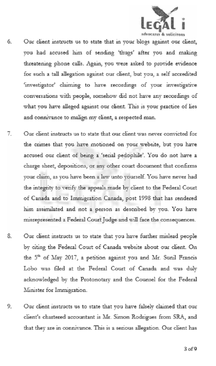 On the same day, June 8, Dixon also sent an eight page nineteen point notice to my “associate” Francis Lobo. He demands Rs 75 lakhs (7.5 million) in damages from him.