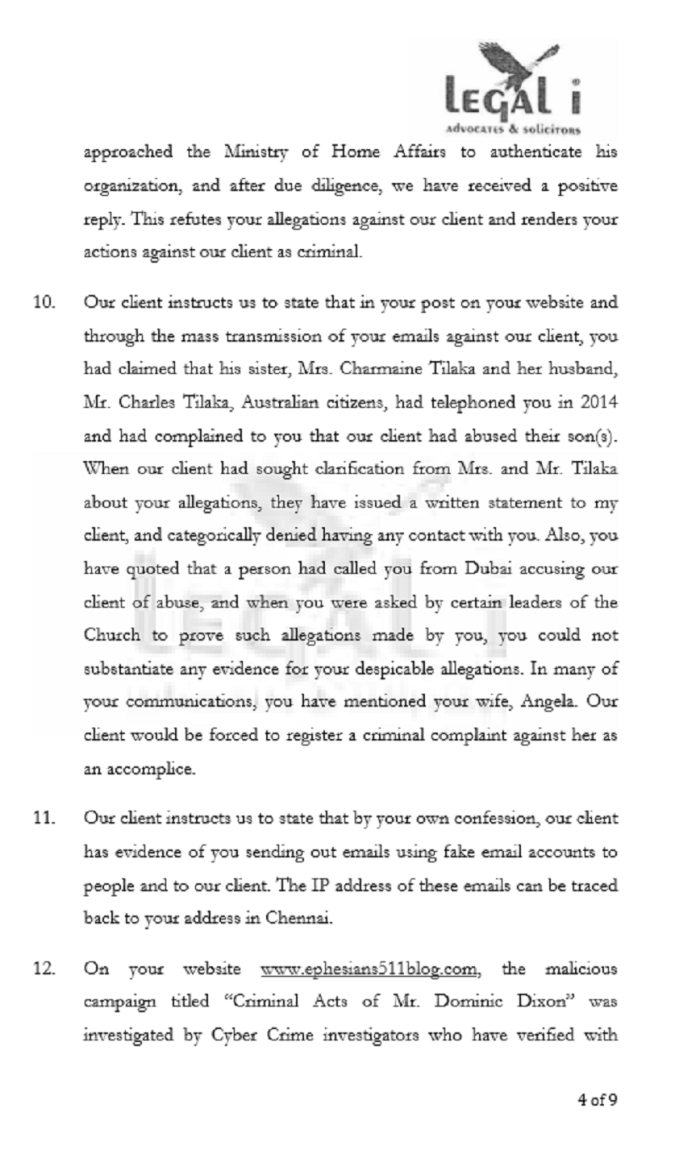 One does not have to wonder why, when filing “legal charges” of defamation against us, Dixon does not refute the very serious claim that his relatives and this ministry have documented about his being a pedophile, convict and deportee. And the other question about the authenticity of his various university degrees and educational qualifications. That, too, is something that the Indian police and courts would be very interested in. And that may only be the tip of the iceberg.