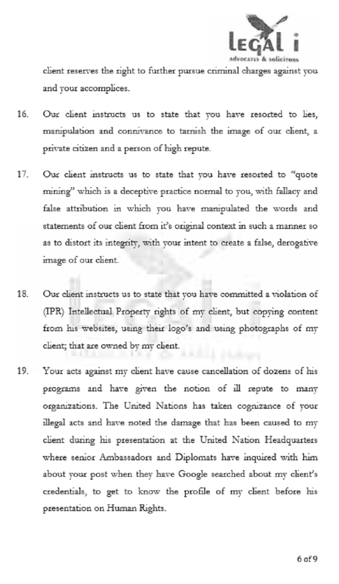 “The United Nations has taken cognizance of your illegal acts and have noted the damage that has been caused to my client during his presentation at the United Nation Headquarters where senior Ambassadors and Diplomats have inquired with him about your post when they have Google searched about my client’s credentials, to get to know the profile of my client before his presentation on Human Rights.”
