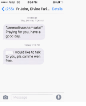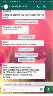 Screenshots of the Warning sent by X to Fr Joby on WhatsApp, December 26, 2016 soon after she learnt from Y that Y had been raped by the priest in Bangalore a year earlier:
