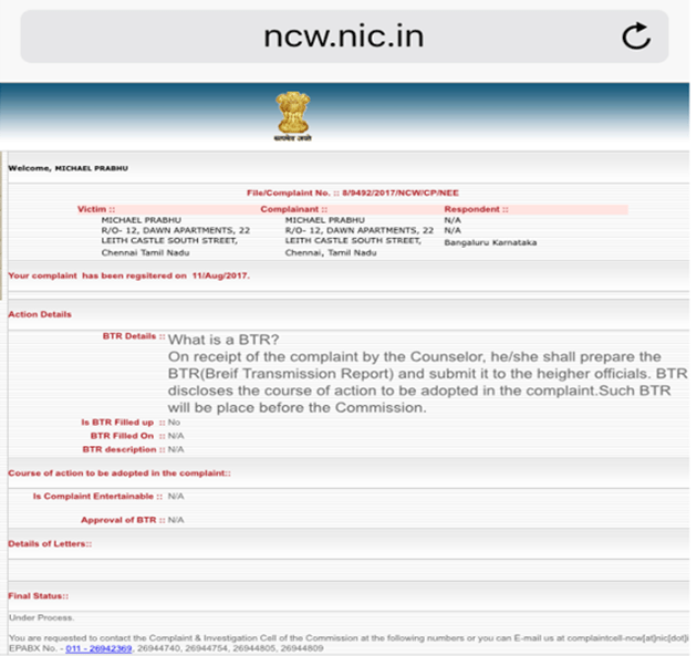 Use this Complaint Registration / File No. and Password for your future reference. The NCW will process your complaint and take action there on at the earliest. You may see the status of your complaint through the above mentioned Login ID and Password.