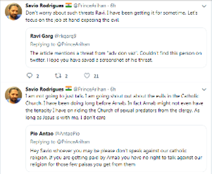 Others, like Pio Antao (@AntaoPio), took offence to a perceived insult to the Catholic religion. Replying to the tweets by Rodrigues (@PrinceArihan), he said: “Hey Savio whoever you maybe please don’t speak against our catholic religion. You have no right to talk against our religion [sic].”