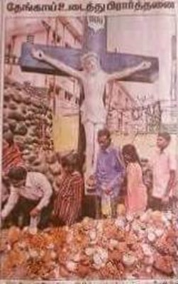 Catholics breaking coconuts as is customarily done before the images of Hindu deities