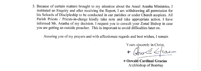 Cardinal Oswald Gracias’ ban on Aneel Aranha and Holy Spirit Interactive ministry precedes that of Bishop Paul Hinder of the Vicariate of Southern Arabia